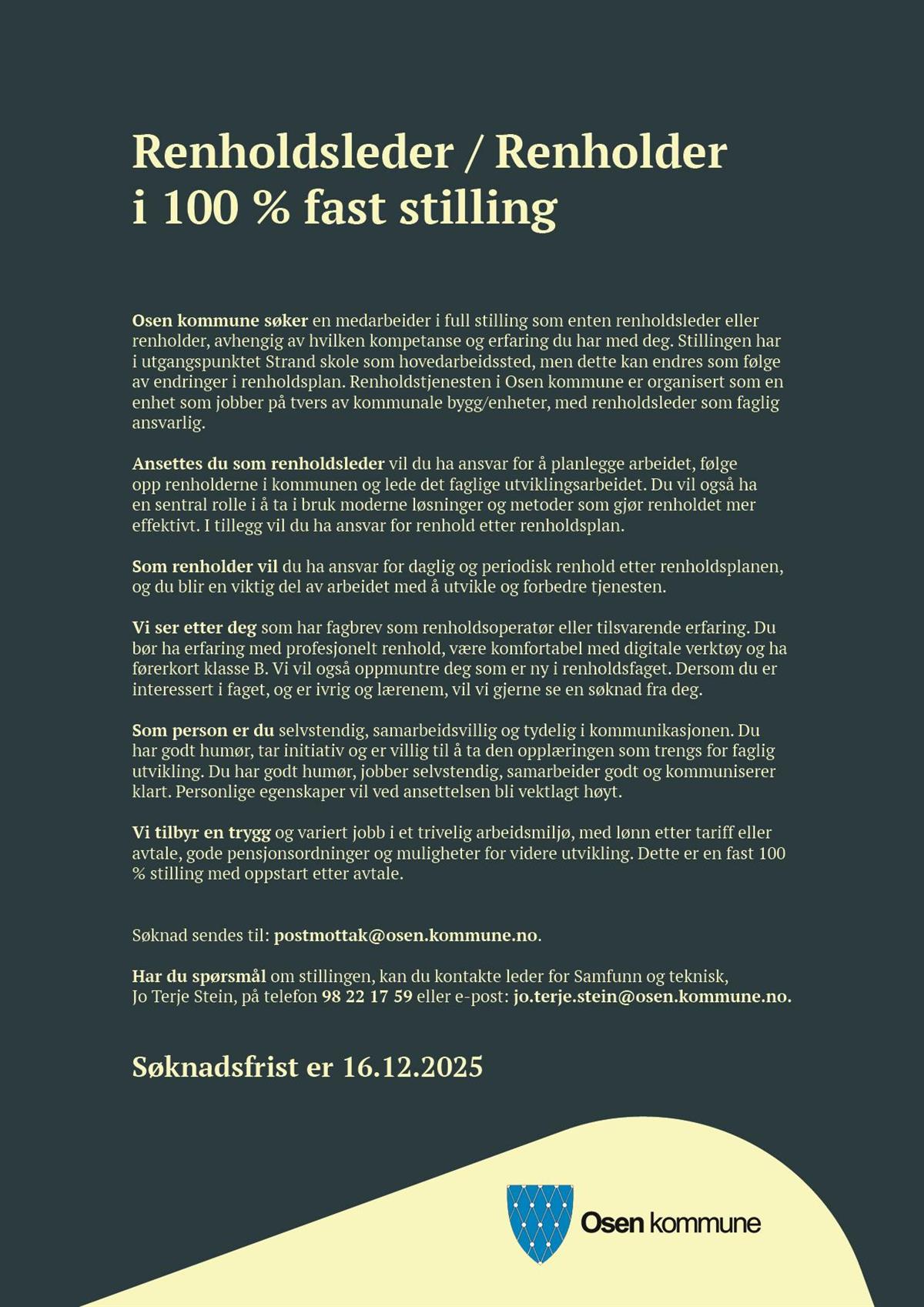 Renholdsleder/Renholder i 100% fast stilling, frist 16. desemberSøknad sendes via e-post: postmottak@osen.kommune.no