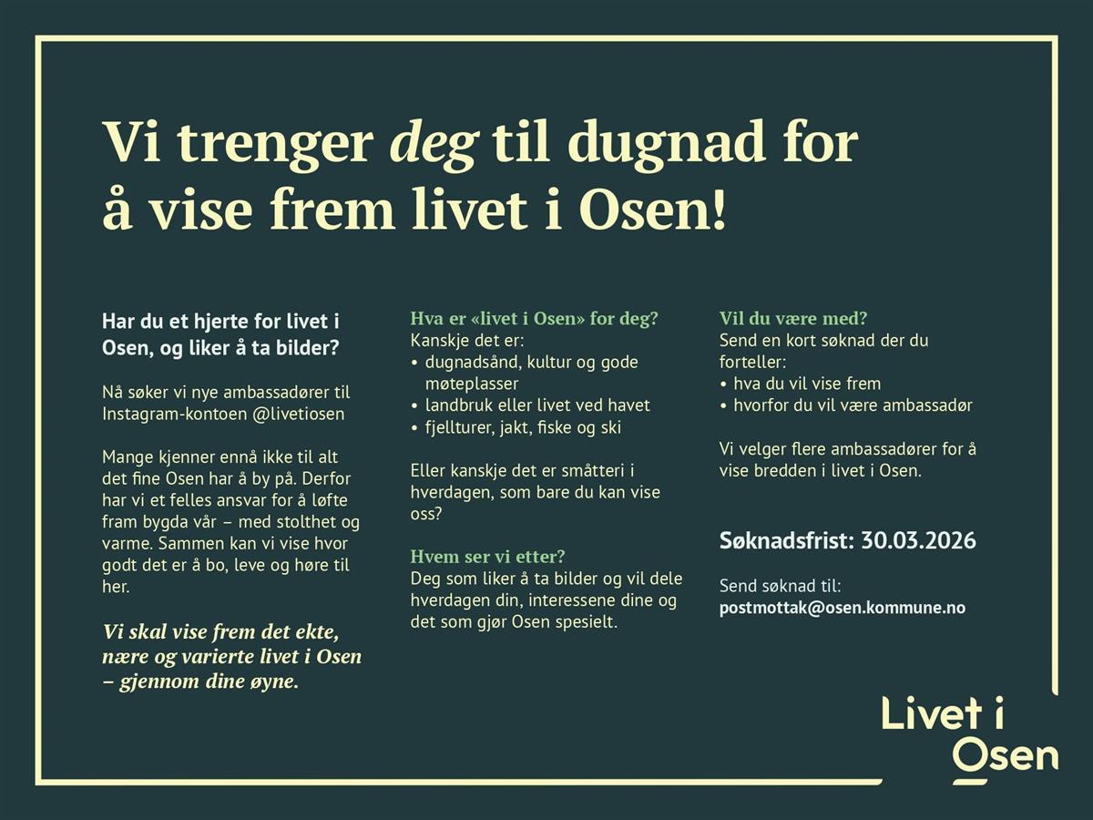 Vi trenger deg til dugnad for å vise frem livet i Osen!Søknad sendes kommunen via e-post: postmottak@osen.kommune.no